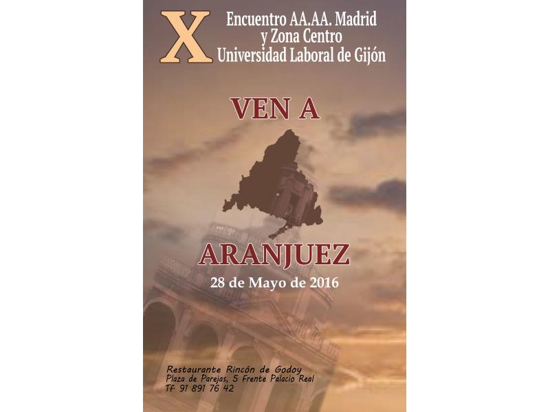 Queridos compañeros y amigos, Me pongo en contacto con vosotros para anunciaros la celebración del X Encuentro de AA.AA. en Aranjuez, el sábado 28 de Mayo, a partir de las 13,30 horas, en el Restaurante Rincón de Godoy, frente a Palacio Real. Aconsejo aprovechar la mañana para visitar Jardines, Palacio Real y Casita del Labrador. Celebramos el 4º Homenaje a los "queridos setentañeros" presentes en el Encuentro... El menú, similar a los de años anteriores, con la incorporación, a petición de unos pocos, del guiso ribereño como plato principal (que puede ser sustituido por una carne ó pescado, comunicándolo con antelación) Agradeceré vuestras rápidas respuestas, aunque sean provisionales y confirmación de quienes, en éste año, cumplan los 70. ¡¡¡ OS ESPERAMOS !!! Un fuerte abrazo, Adolfo Ramos Delegado Territorial Madrid-Zona centro 619.937466 91.8912192